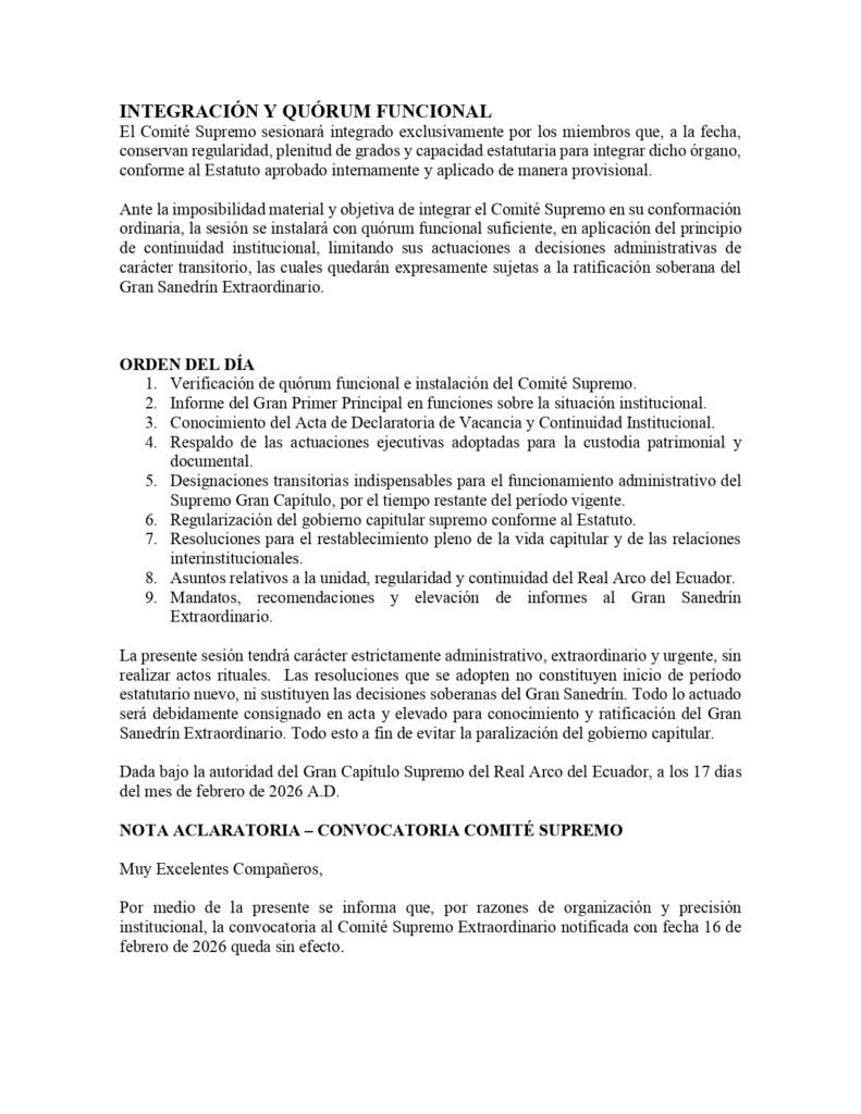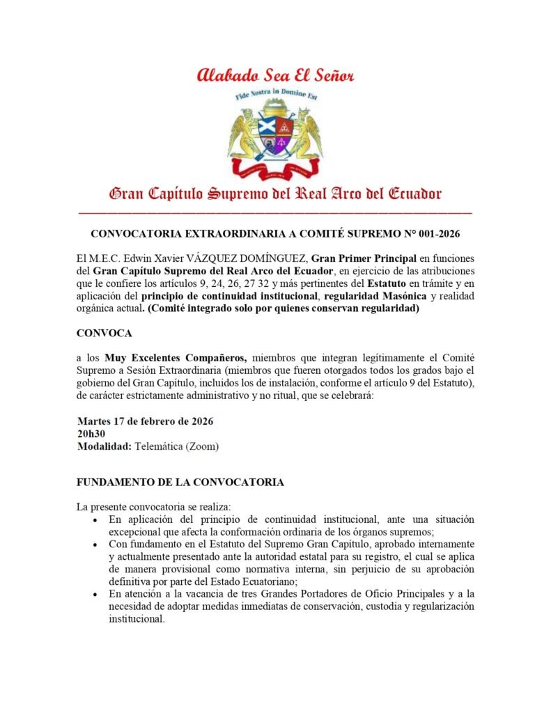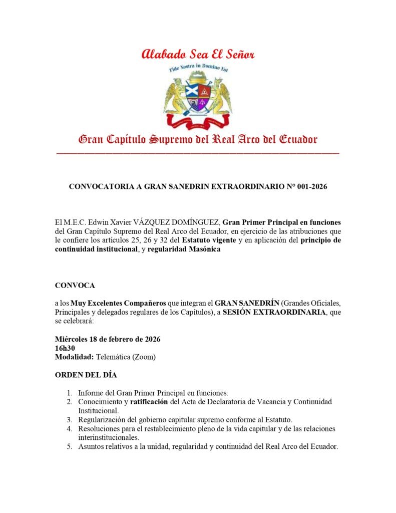 La información institucional del Supremo Gran Capítulo de Masones del Real Arco del Ecuador se encuentra en proceso de actualización, conforme a las actuaciones adoptadas por los órganos estatutarios convocados.